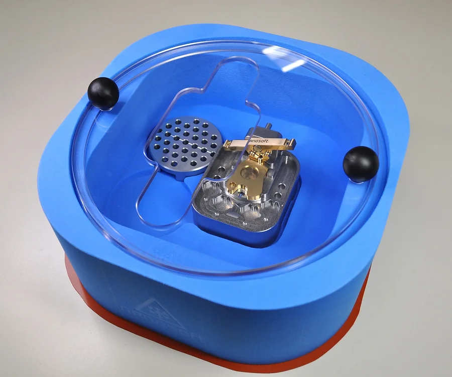 クリッピングステーションは、Thermo Fisherのオートローダー用クライオEMグリッドのクリッピングに最適化された設計で、使いやすさと効率を提供します。高品質フォームデュワーは、汚染のリスクを減らしながら使いやすさを向上させます。新しいクリッピングメカニズムとよく設計された蓋により、作業が容易になります。また、NanoSoftとThermo Fisherのツールと互換性があります。特殊なメカニズムを用いたハブは、クリッピングツールの正確な位置決めを支援し、ツールやグリッドボックスの簡単なアクセスを可能にし、高品質なクリッピングを実現します。ステーションの蓋は、周囲の環境からの適切な保護を提供しながらアクセスの容易さを保ちます。