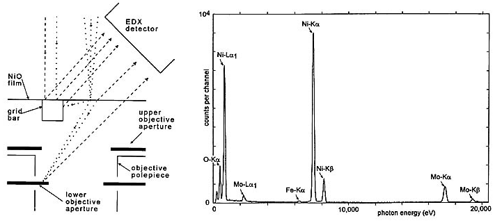 テスト試料は、TEM鏡筒にある漂遊X線と電子を計測するためのモリブデン信号を発します。NiOxフィルムには既知量の軽元素(酸素)を含み、低エネルギーX線へのEDX検出器の反応を評価するのに用いられます。EELSでは、酸素とニッケルのイオン化エッジによって、エネルギー軸の較正と、元素割合の測定が可能になります。EDXとEELSの両方を装備したTEMでは、EDXで得られた元素分析とEELSで得られた分析を直接比較することが可能です。