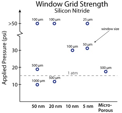 500×500μmウィンドウ内の20nmまたは50nm厚の窒化シリコン膜に、2μmの微細孔がパターン形成されています。微細孔ウィンドウは様々な薄膜(例:グラフェン)のマウントに使用できます。また、CryoEM及び高傾斜トモグラフィーに使用することができます。70°傾斜角では、斜角の付けられた薄い100μmフレームは、どんな回転配向からのウィンドウ中心内領域(~50×50μm)も使用することができます。